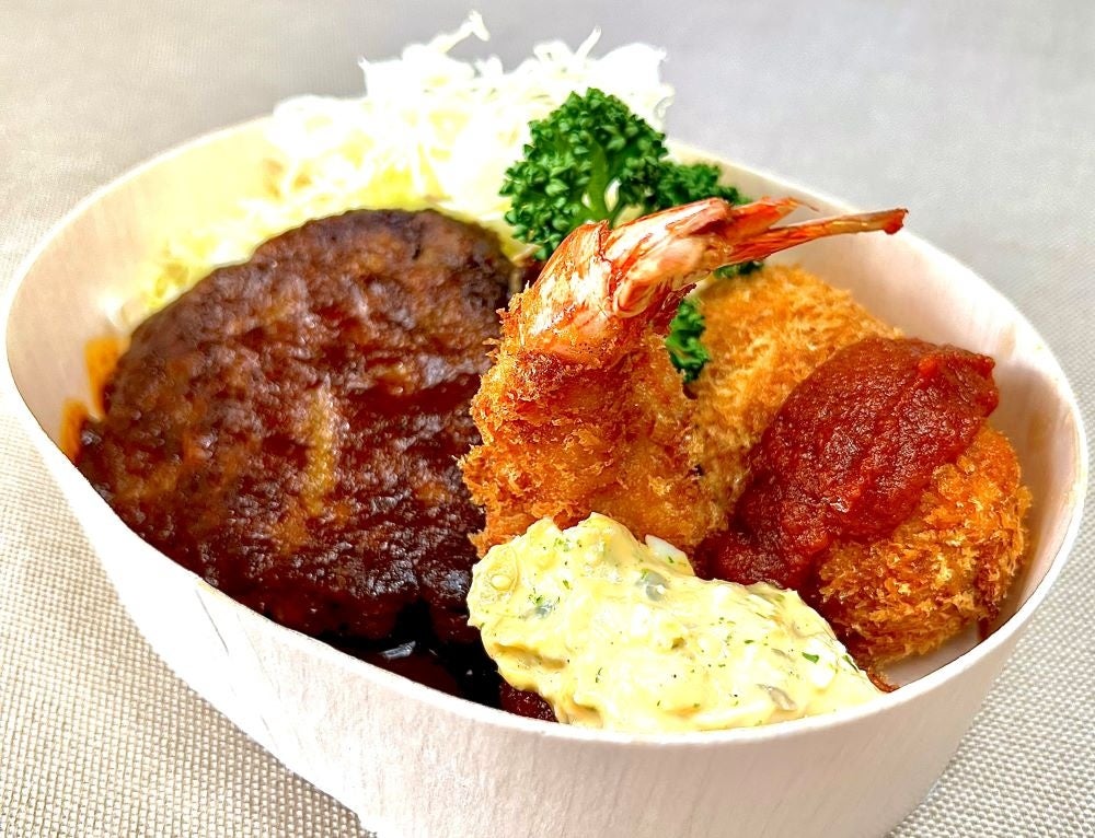 ハンバーグ、エビフライ、そして店主の小川さんが自身のお母さんの味を再現したというクアトロコロッケが入った、大人の洋食弁当です。