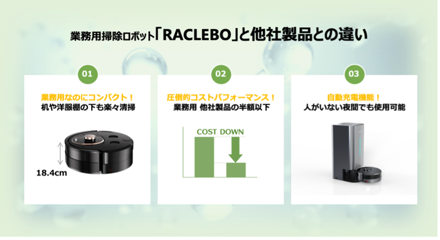 業務用の清掃範囲の広さ、家庭用のコンパクトさを兼ね備えた「RACLEBO」。他社の業務用掃除ロボットと比較すると、半額以下で手に入る圧倒的コストパフォーマンスを実現しています。また、自動機能が多数搭載されているため、初めて掃除ロボットを購入される企業様でも安心して導入できます。