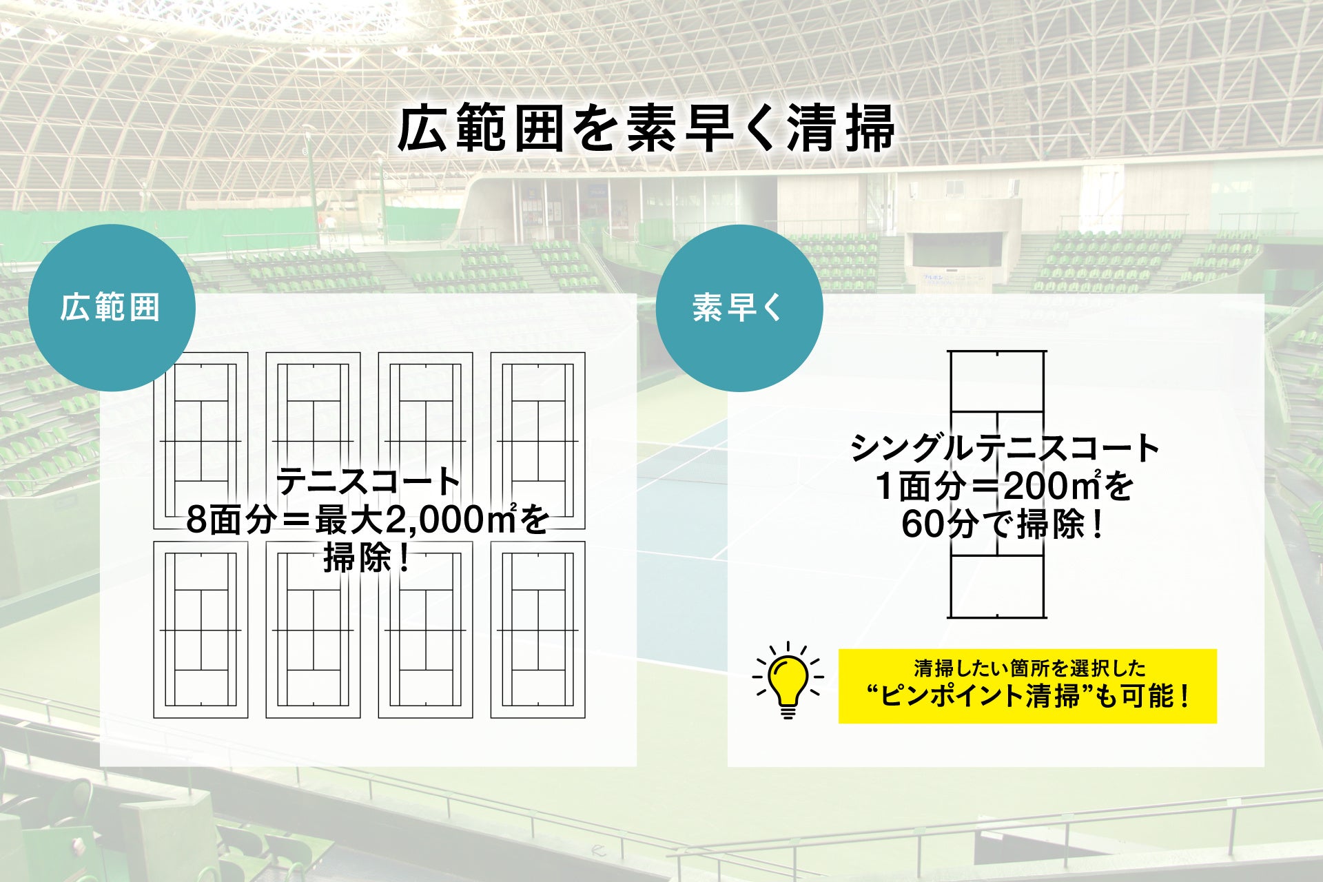 テニスコート8面分=最大2000㎡の屋内で使用可能です。コンパクトでありながら200㎡を60分で清掃でき、連続で約3時間清掃できます。また、飲み物をこぼした時などの “ここだけ掃除したい” も実現します。