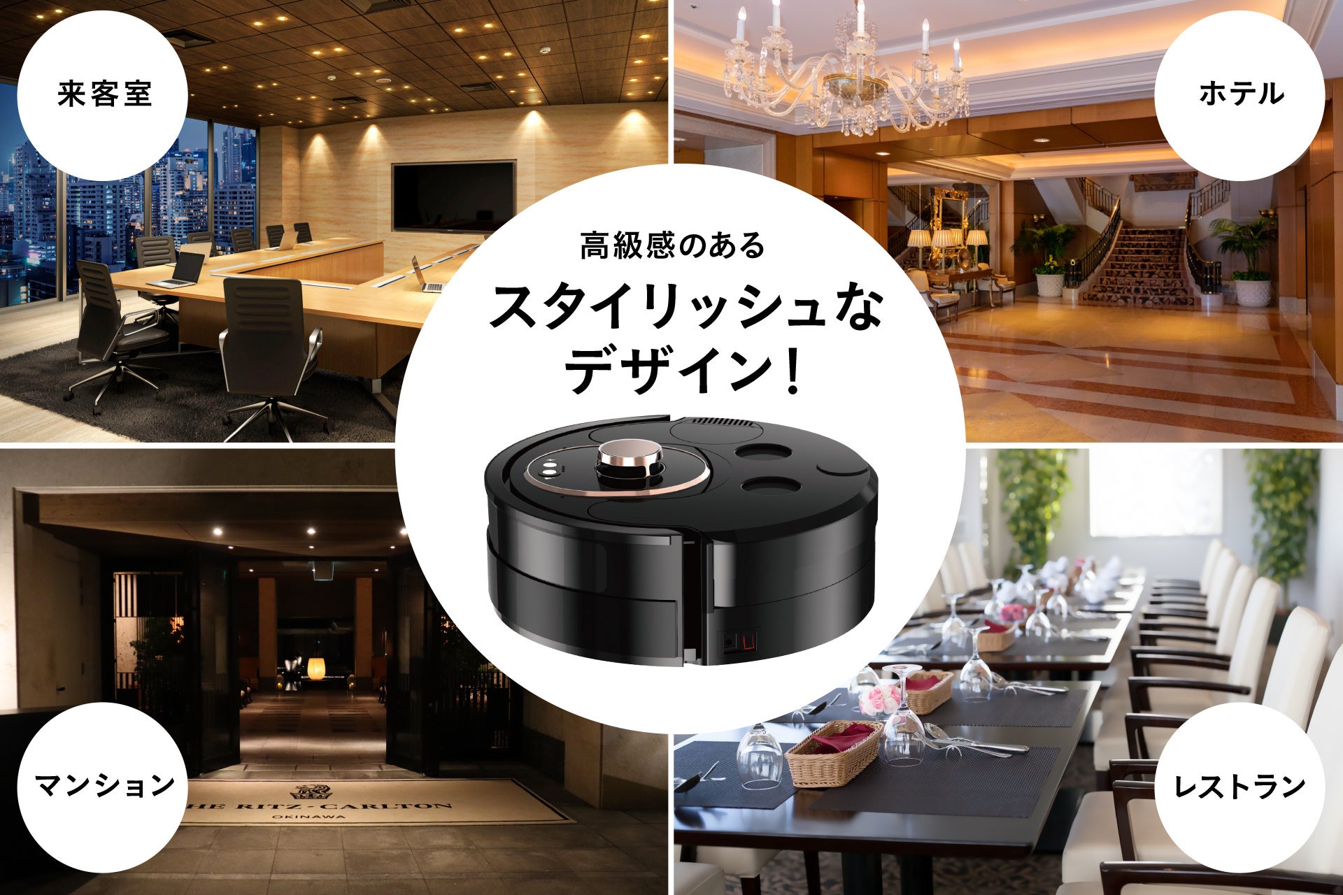 水換え・ゴミ回収・充電を1台でできるRACLEBO。高級感ある見た目と小回りの良さから、オフィスやホテルなど小・中規模施設向けにオススメです。デスク下などの狭いところの清掃にもご活用いただけます。