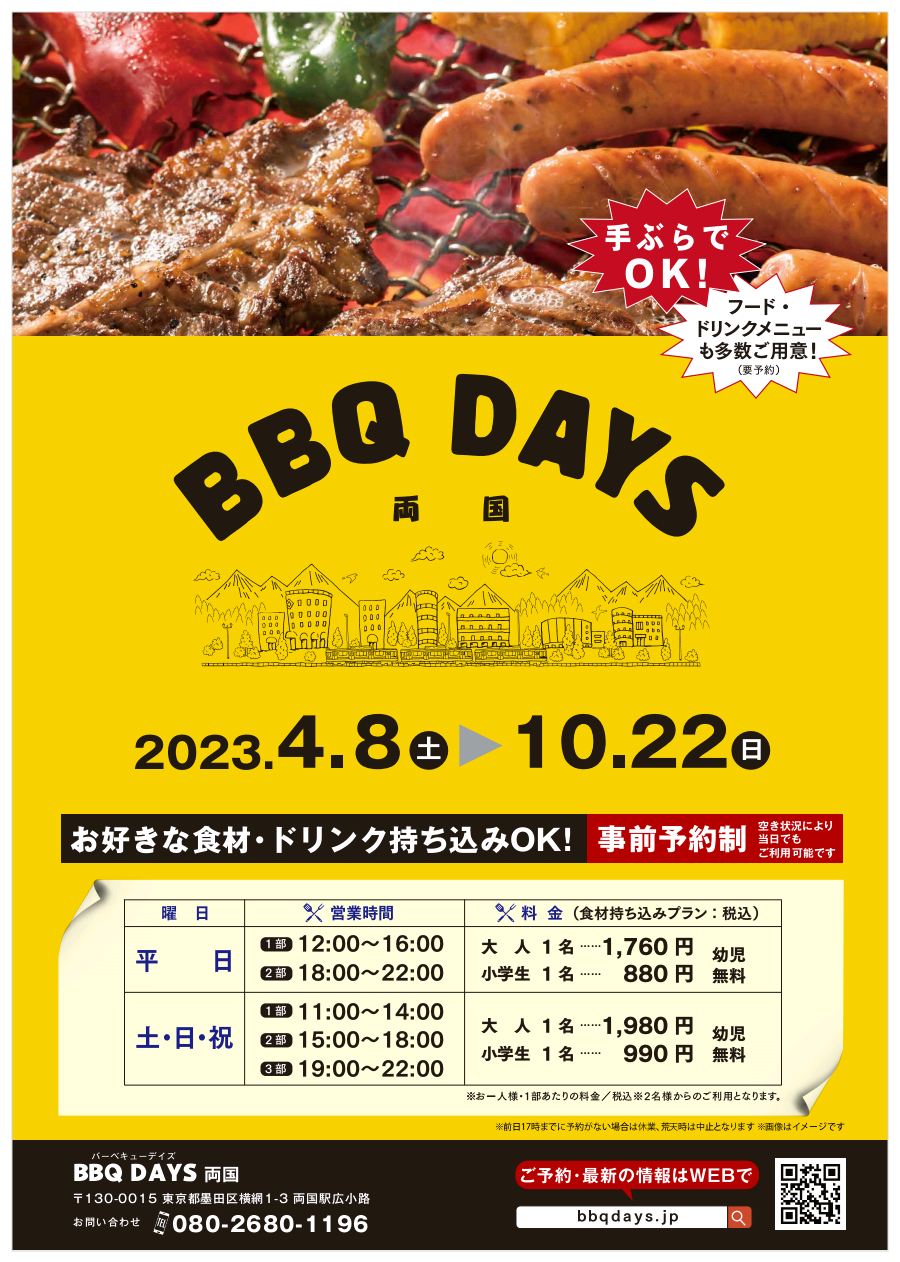 おすすめバーベキュー予約ならBBQDAYS がJR両国駅前の広小路広場(東京都墨田区)にてバーベキュー場「BBQDAYS両国店(TEL 080-2680-1196)」をオープン。期間は4月8日-10月22日。
