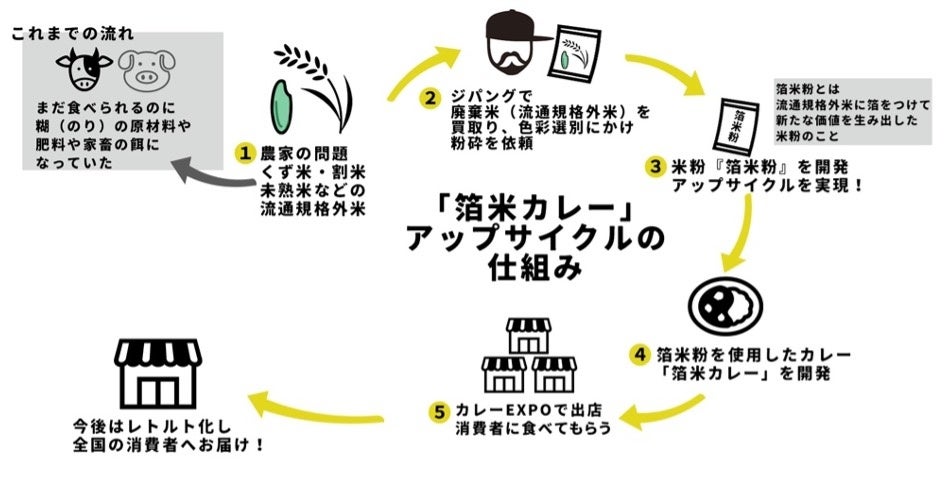 株式会社ジパングフードリレーションズ(本社:大阪市北区、代表取締役:安藤育敏)は、運営するジパングカリーカフェの新しい取組みとして、廃棄米(流通規格外米)をアップサイクルさせて作る『箔米カレー』を 完成させました。4月15日・16日・22日・23日に開催される第10回カレーEXPOで、先行販売いたします。箔米カレーとは、日本で問題になっている「食品ロス」に立ち向かい、社会に貢献できる自社のオリジナルプロジェクトである「箔米プロジェクト」の取り組みの1つです。農家で問題になっている割米や未熟米などの流通されない規格外米を米粉にした「箔米粉」(自社開発商品)を、自社の得意分野である和風出汁のカレーと合体させる事で、食べるだけでSDGsに貢献できる「箔米カレー」を開発しました。今回のカレーEXPOでは相性の良い山形牛すじと合わせたスペシャルバージョンとなっております。*(箔米®︎)は(株)ジパングフードリレーションズの商標登録名です