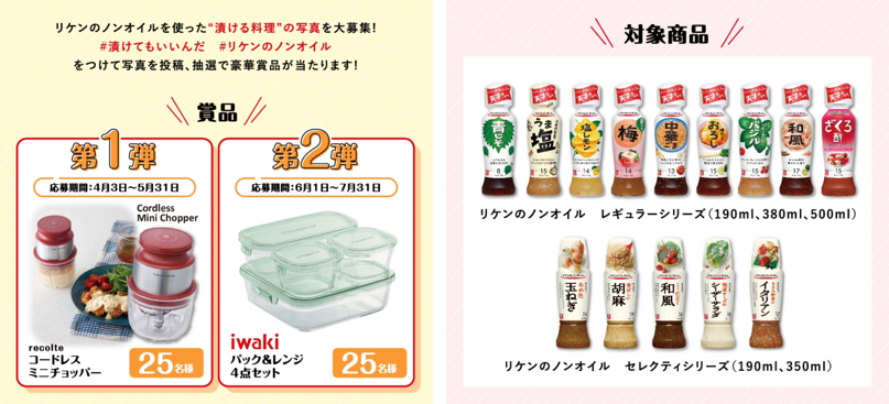 「#漬けてもいいんだ #リケンのノンオイル」をつけて、対象商品と漬けレシピ写真を投稿してください。