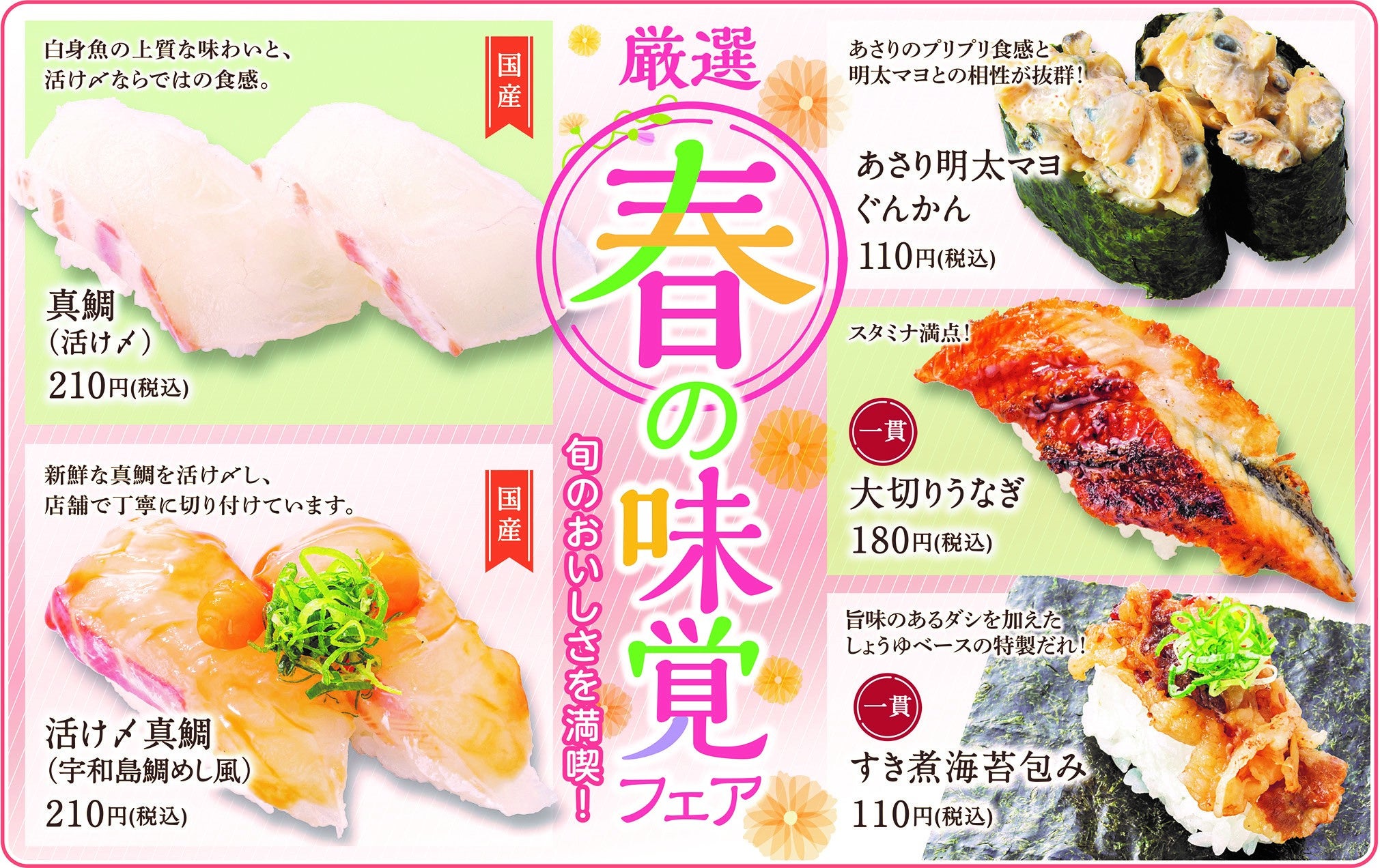 また、活け〆真鯛やあさりなどの春に旬を迎えるネタが大集合する『春の味覚フェア』も好評開催中です!