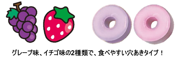 キシリトールを甘味料中100%使用、食べやすい穴あきタイプのタブレットです。お子様に人気のグレープ味とイチゴ味の2種類をアソートしています。お子様が歯みがき後にもお召し上がりいただけます。パッケージデザインには、新たに、しまじろうのお友達や家族が新登場!チャック付きパウチタイプですので、いつでもどこでも持ち歩いて、ぜひお友達やご家族とも一緒にお召し上がりください。