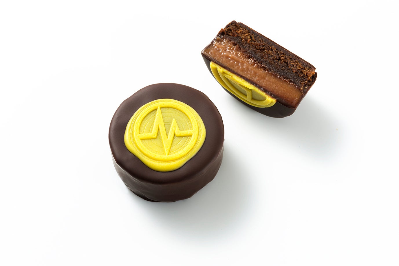 ヘーゼルナッツのビスケット生地に、ユズを加えたガナッシュを重ね、ダークチョコレートで包みました。