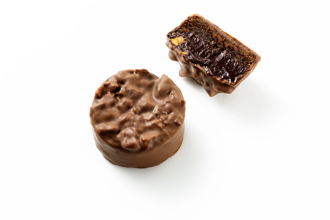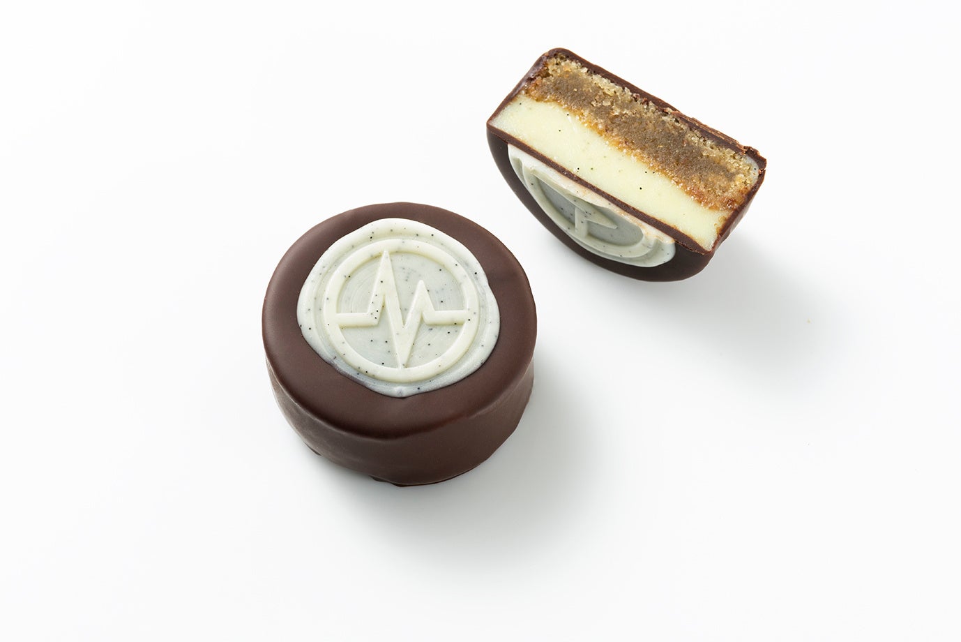 ヘーゼルナッツのビスケット生地にバニラのガナッシュを重ね、ダークチョコレートでコーティング。