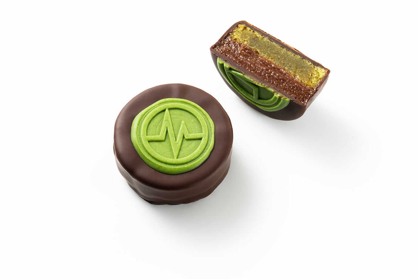 ピスタチオのビスケット生地に、キャラメルのガナッシュをのせ、ダークチョコレートでコーティング。
