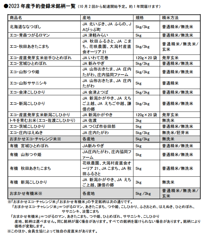 2023年産予約登録米銘柄一覧(10月2回から順次配達開始予定。約1年間お届けします)