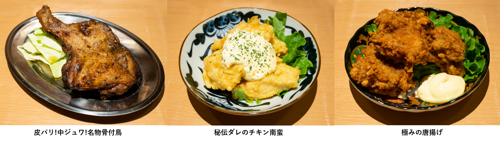 本家てけてけのメニューをベースに、渋谷本店でしか味わえない「皮パリ!中ジュワ!名物骨付鳥」など、オリジナル商品をご用意いたしました。他にも、見ているだけでもわくわくするような華やかなラインナップを取り揃えています。