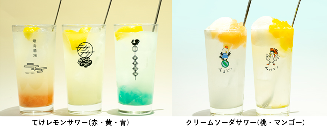 「てけてけ」で大好評の自家製サワーてけレモンは「赤」「黄」「青」の三種に拡充し、見た目にも華やかにグレードアップ!他にも、クリームソーダサワーの「桃」「マンゴー」など、渋谷本店だけのドリンクをオリジナルグラスでご提供いたします。