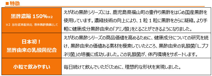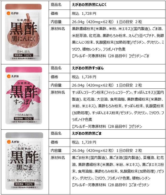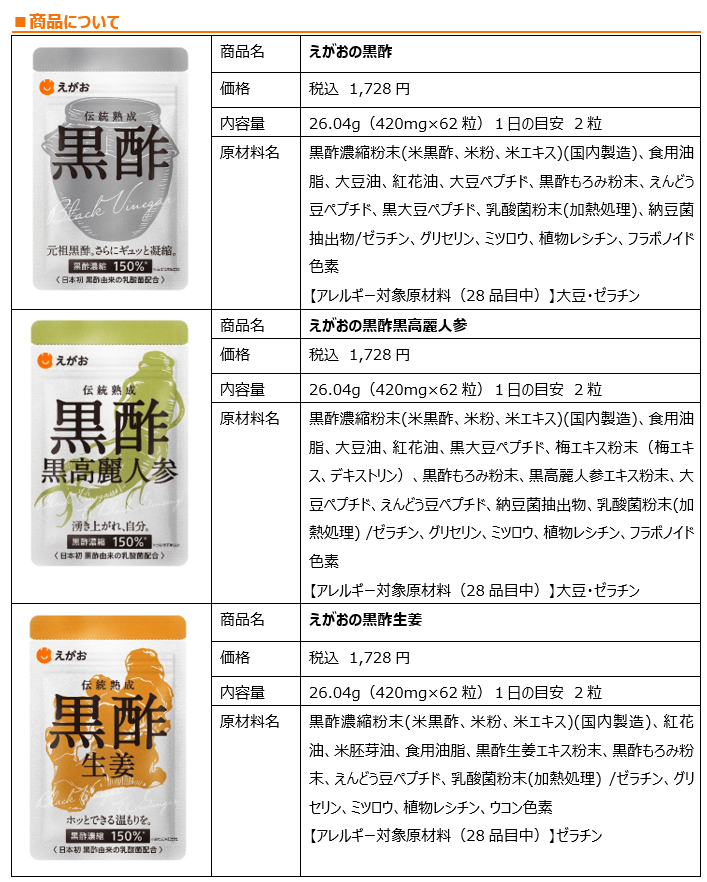 株式会社えがお(代表取締役会長兼社長 北野忠男 / 所在地:熊本県熊本市東区東町4-10-1)は、2023年4月1日(土)より15年連続売上日本一※1の「えがおの黒酢シリーズ」を全商品一斉リニューアルいたしました。価格はそのままで、商品名、粒の形状、パッケージを統一し、特徴新たに生まれ変わりました。他にない、オリジナリティのあるデザインで、シリーズ商品としてイラストでデザインを統一いたしました。※1えがおの黒酢シリーズ合算値 2023年2月東京商工リサーチ調べ