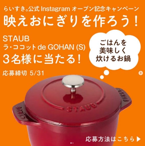 らいすき。公式インスタグラムで「映えおにぎりをつくろう!キャンペーン」を実施します。らいすき。公式アカウント(@rice.ki_official)をフォローし、投稿に「いいね」。”映えるデコおにぎり”の写真をハッシュタグ「#らいすき」「#映えおにぎり」をつけて投稿すると抽選で3名様においしいお米が炊ける「ストウブ ラ ココット de GOHAN S チェリー」が当たります。さらにダブルチャンスとして、7名様には日本各地のお米をプレゼントします。