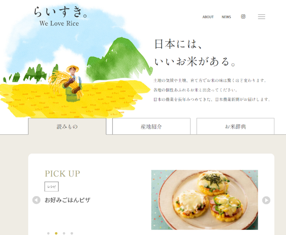 国内唯一の日刊農業専門紙を発行する株式会社日本農業新聞(本社:東京都台東区、代表取締役社長:廣田武敏)は、 4月3日より国産農産物の消費拡大策の一環として、米産地のこだわりやおすすめレシピなどを紹介する米の情報発信サイト「らいすき。」をオープンします。