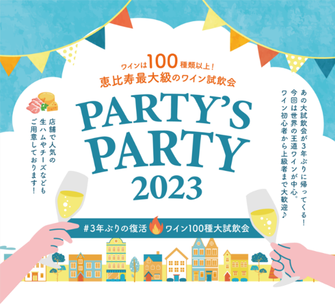 「PARTY’S PARTY」はワイン初心者の方から上級者まで、世界中のワインを一度に楽しめる人気の試飲イベントです。当日は(株)恵比寿ワインマート直営のワイン専門店「WINE MARKET PARTY(ワインマーケットパーティ)」の取扱商品やロングセラー商品を中心に世界各国のワインを100種類以上ラインナップします。また、「WINE MARKET PARTY」で人気の生ハム・チーズなどもご用意しており、ペアリングもお試しいただけます。