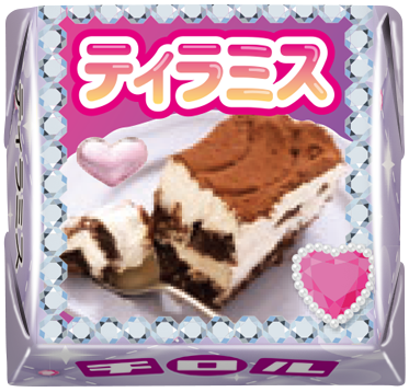ココアパウダーをチーズチョコで挟みトップにコーヒーチョコを合わせ、見た目も味もティラミスを表現。ほろ苦さと甘さが絶妙なバランス。