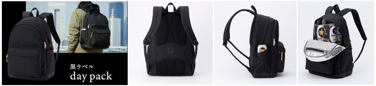 今回のコラボレーションモデルでは、メインルームに保冷機能を装備し、アウトドアアクティビティでも買い物でもビールを購入するときに便利な機能を追加。シンプルな黒基調で、黒ラベルのロゴやゴールドカラーをトッピング。