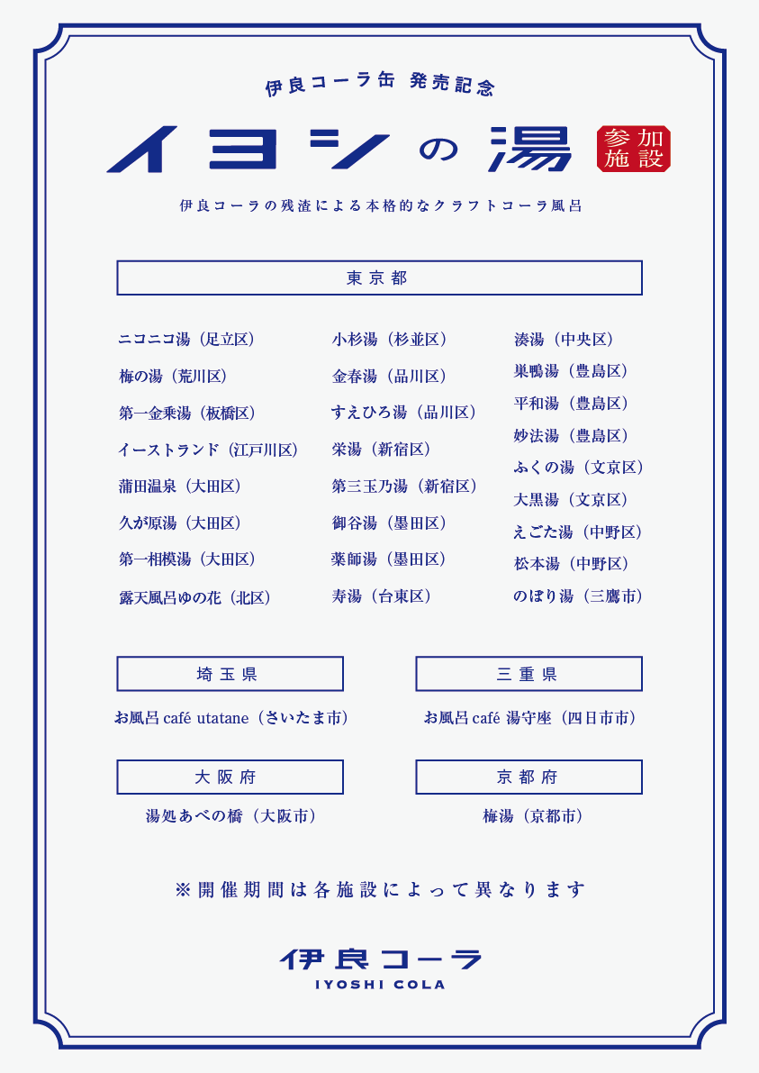 世界初のクラフトコーラ専門メーカー/専門店*「伊良コーラ(いよしコーラ)」(代表:小林隆英)は、5都府県29施設の銭湯・サウナとコラボレーションしたイベント「イヨシの湯」を、2023年4月7日(金)から順次開催します。