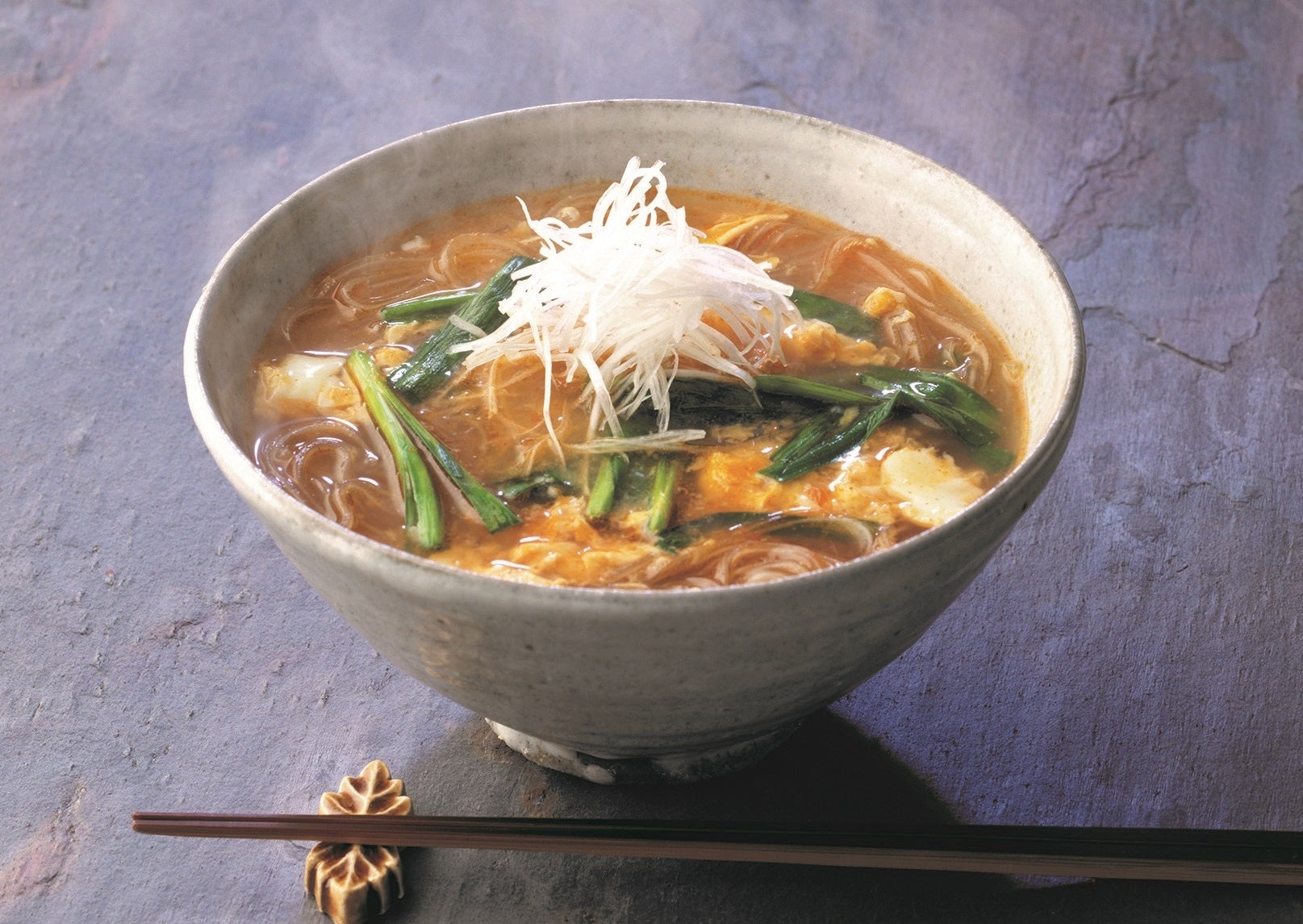 煮干しだしをベースに、辛味噌仕立てでピリ辛に仕上げました。炒めたニラ、溶き卵、白髪葱などを加えてお召し上がりください。