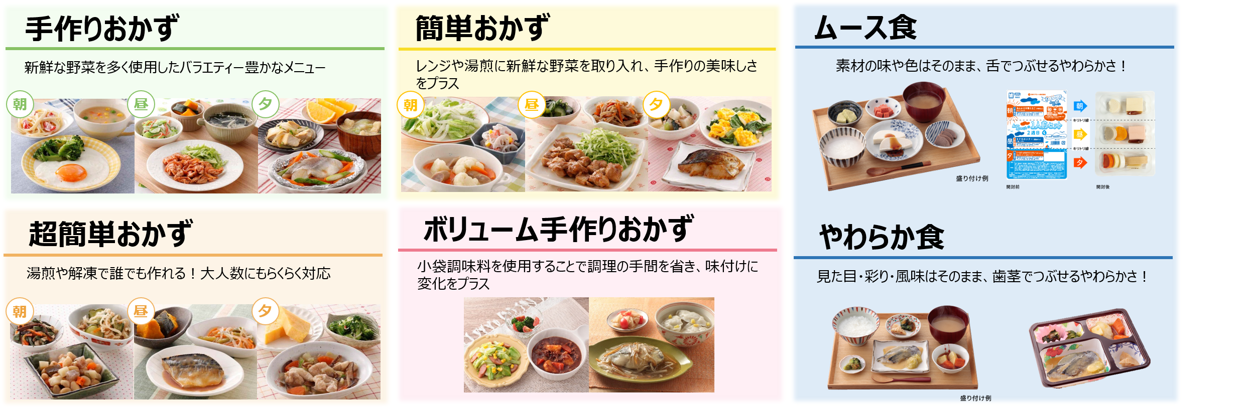 施設のニーズに合わせた調理方法や調理時間が異なる4つのメニューコース「手作りおかず」「簡単おかず」「超簡単おかず」「ボリューム手作りおかず」と、オプションメニューの「ムース食」と「やわらか食」を販売。ミールキット宅配事業での実績とノウハウを活かし、メニュー開発から食材の調達、自社便による配達まで一括で実施。そして、自社便だからできるお客様からの「声(ニーズ)」を直接聞き取り、施設のニーズに寄り添った豊富な商品提供を行う『もっとGood!システム』を導入しています。