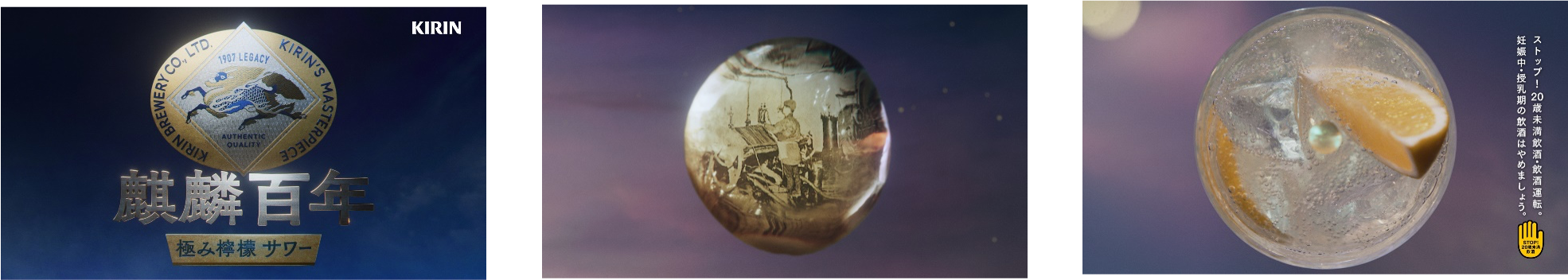 新TVCMは、「麒麟百年極み檸檬サワー」の滴に、これまでキリンビールが歩んできた歴史が映し出されて