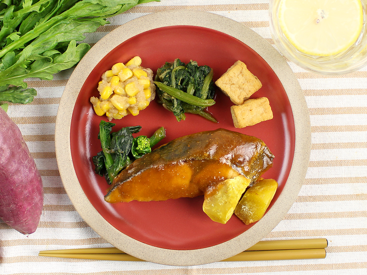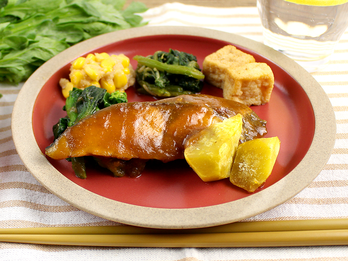 ふっくらと焼き上げた鰆に山椒、甘みのある醤油だれ、すっきりとしたみそだれをあわせました。さわやかな香りが特徴の山椒と甘さとコクのある醤油味噌だれで食べやすく仕上げております。添え野菜の菜の花、甘みあるさつまいもと共にお召し上がりください。