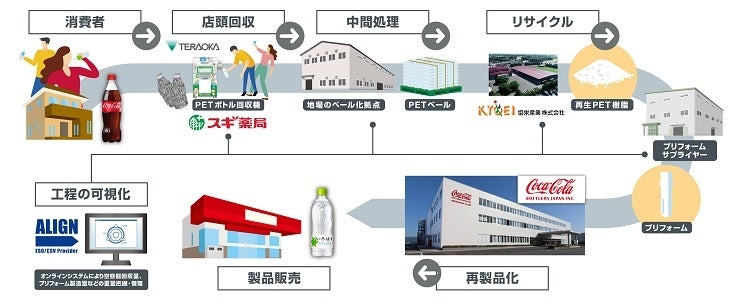 このたび4社で展開する「ボトルtoボトル」では、「スギ薬局」店頭に使用済みPETボトルの回収機(株式会社寺岡精工製)を設置、回収されたPETボトルは減容処理を経て、リサイクラーである協栄産業株式会社の工場で再原料化されます。再生されたPET原料は、当社各工場にてコカ・コーラ社製品の容器に使われます。また、店頭で回収されたPETボトルからプリフォームまでの重量を株式会社アラインのオンラインシステムによって可視化することで、トレーサビリティを構築・実施しています。