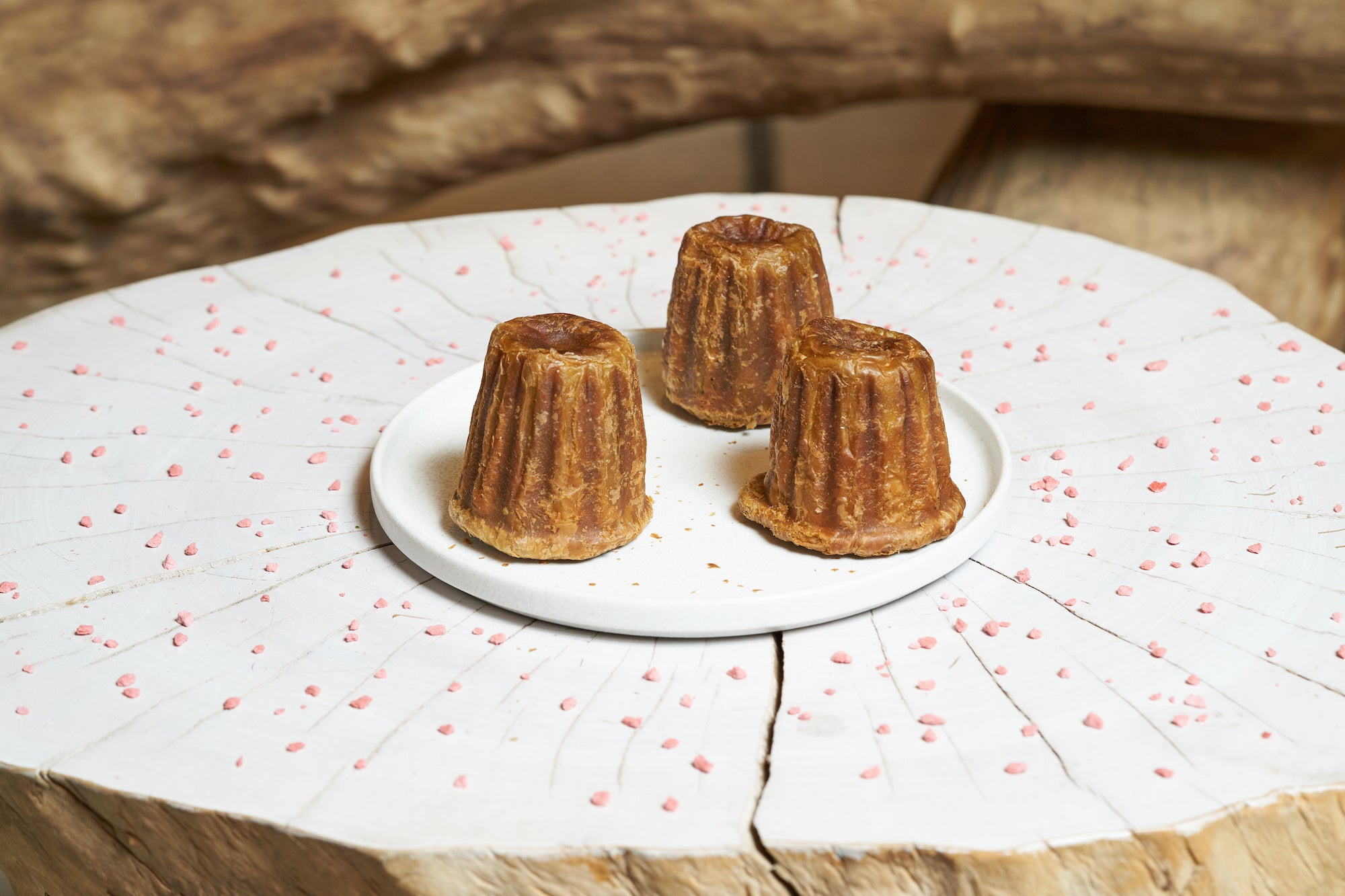抹茶バターを折り込んだ抹茶クロワッサン生地に、粒あんと栗をゴロリと一粒包み、カヌレ型に入れてパリッと焼き上げました。