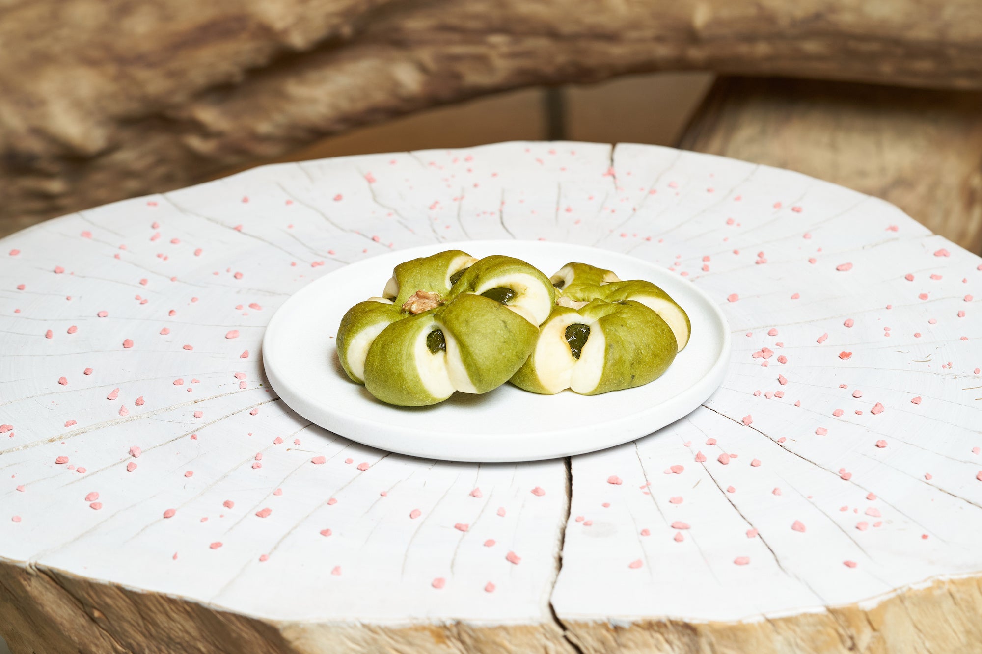 甘い菓子パン生地に抹茶を練り込み、濃厚な抹茶クリームも包み込んでかわいいお花型に焼き上げました。