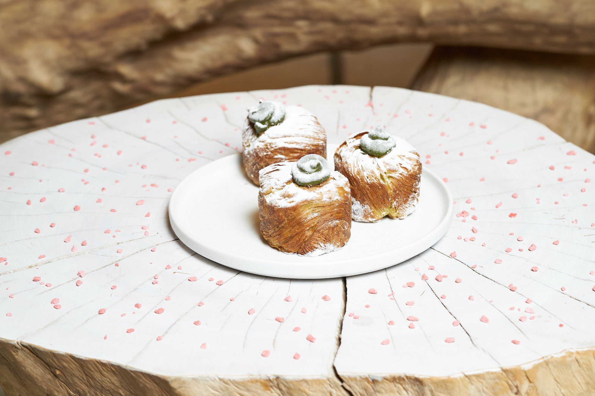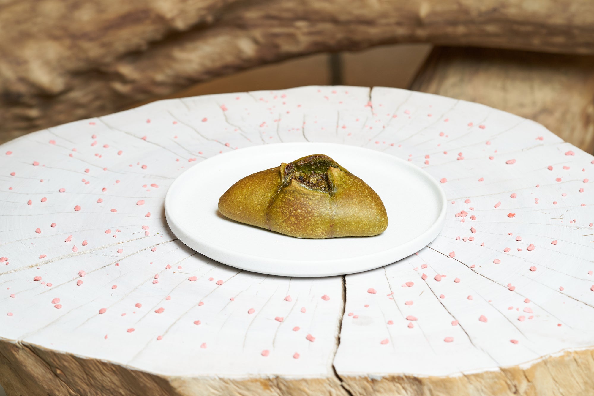 クロワッサン生地に抹茶バターを折り込んだ抹茶クロワッサン生地をマフィン型に入れ焼き上げました。