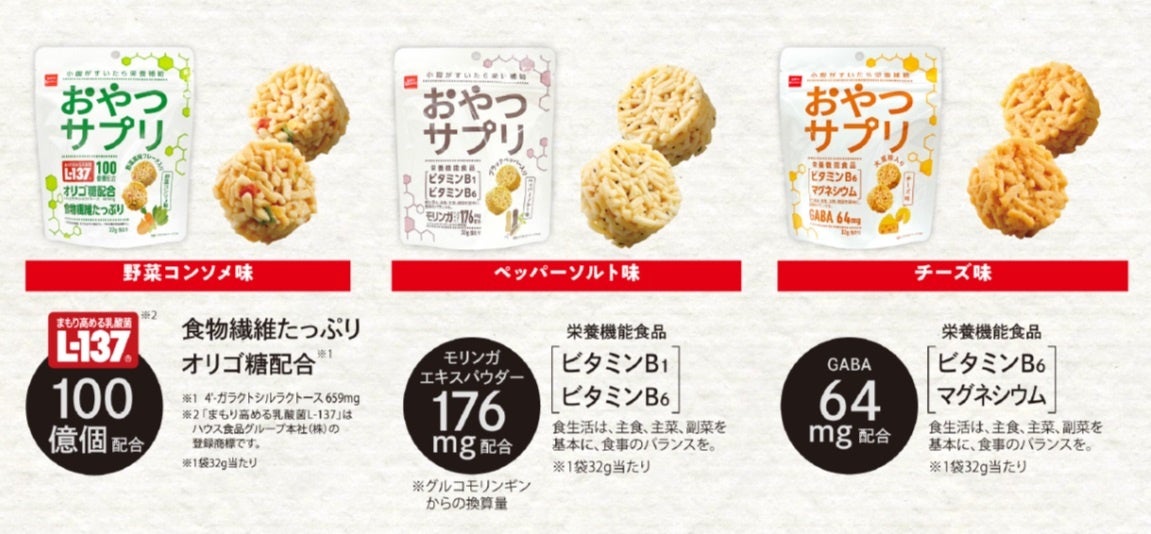 カラダがよろこぶ成分とスナック菓子らしいフレーバー展開で、『おやつサプリ』は日々のおやつタイムをココロ豊かで楽しい時間に変えていきます。