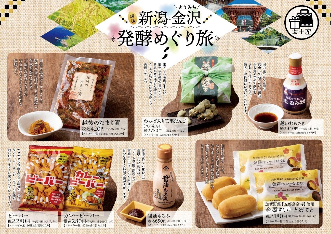加賀野菜の一つ、「五郎島金時」を使用した「金澤すいーとぽてと」、加賀生まれ北陸育ちの「ビーバー」「カレービーバー」、毎年人気のお漬物「越後のたまり漬」、新潟県産笹粉を使用した「わっぱ入り笹串だんご」、万能調味料としても使用できるだし醤油「越のむらさき」、麹菌、酵母、乳酸菌の3つの菌をとることができる(株)ヤマト醤油味噌さんの「醤油もろみ」の7種類のお土産をご用意いたしました。ご自宅でも旅気分を堪能できる商品を取り揃えております。