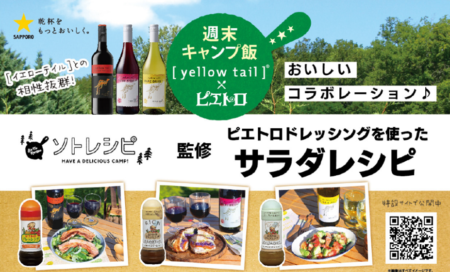 また、特設サイトでは、日本初のキャンプ料理レシピサイト「ソトレシピ」が監修したサラダレシピを公開中です。ピエトロドレッシングを使った“サラダ”キャンプ飯と[イエローテイル]の相性は抜群です!