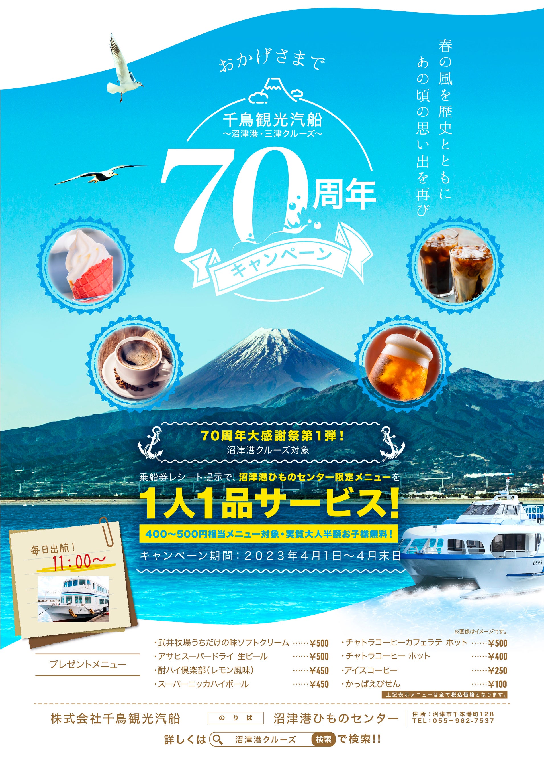 まずは第一弾企画「沼津港クルーズでメニュー1品プレゼントキャンペーン」をスタートいたしますので、過去にご乗船いただいたお客様へも「あの頃の思い出を再び」思い出していただきたく、是非、この機会に「沼津市唯一の遊覧船、ちどり沼津港クルーズ」をお楽しみください。