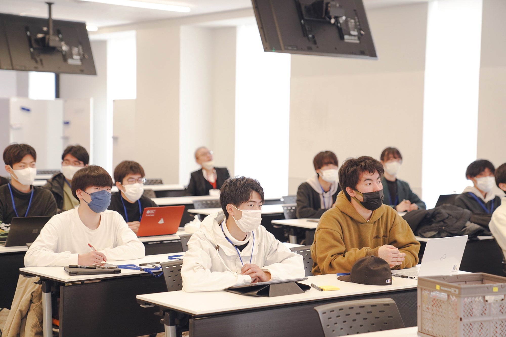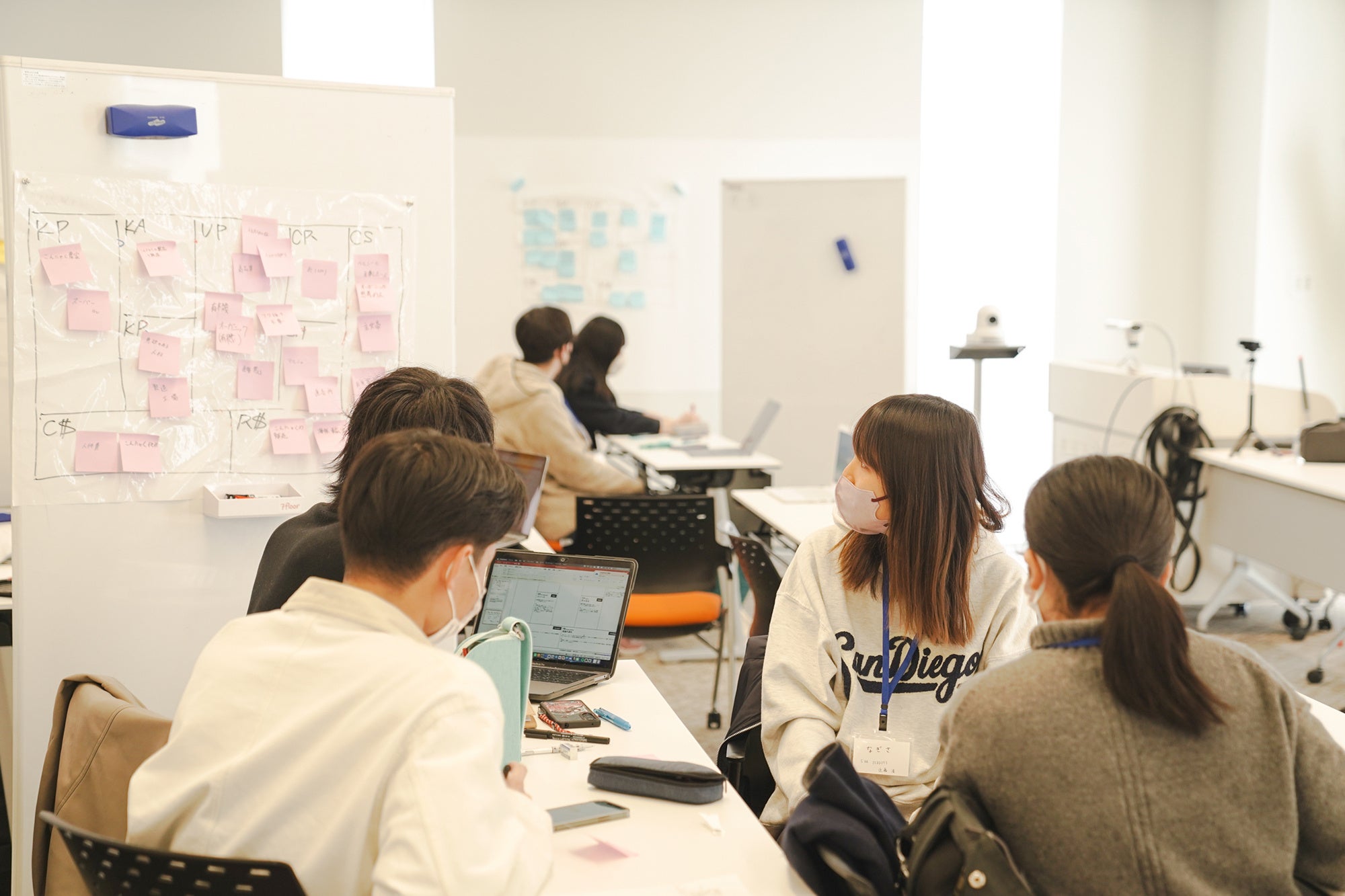 3月20日には、代表の学生が大阪・堺市にある中尾食品工業の工場を見学。有機こんにゃく芋を使った昔ながらのこんにゃくの作り方をはじめ、製品づくりのこだわりや、さまざまなこんにゃくの知識を教わりました。その様子はすべて桃山学院大学ビジネスデザイン学部キャンパスにもリアルタイムで中継され、その他の学生たちもオンラインで見学しました。その後も学生たちはチームの仲間とのディスカッションやフィールドワークを通して、ビジネスアイデアを磨いていきました。