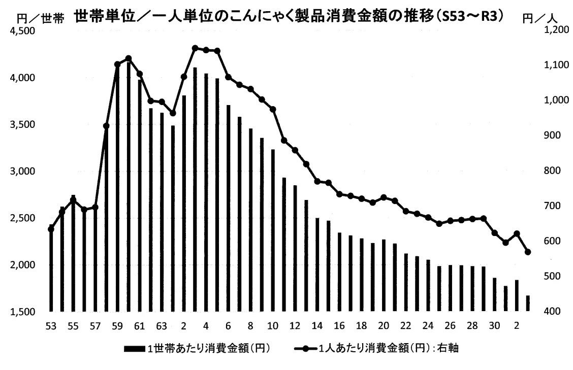こんにゃくは古くから日本の食文化に根付いてきた伝統食材ですが、日本人の食生活の変化によりこんにゃくの消費量はピーク時の平成3年から令和元年に42%程度まで年々落ち込んでおり、慢性的な後継者不足も相まって多くのこんにゃく製造企業は廃業や倒産を余儀なくされ、日本の伝統的産業であるこんにゃく産業の衰退に歯止めがかからない状況です。