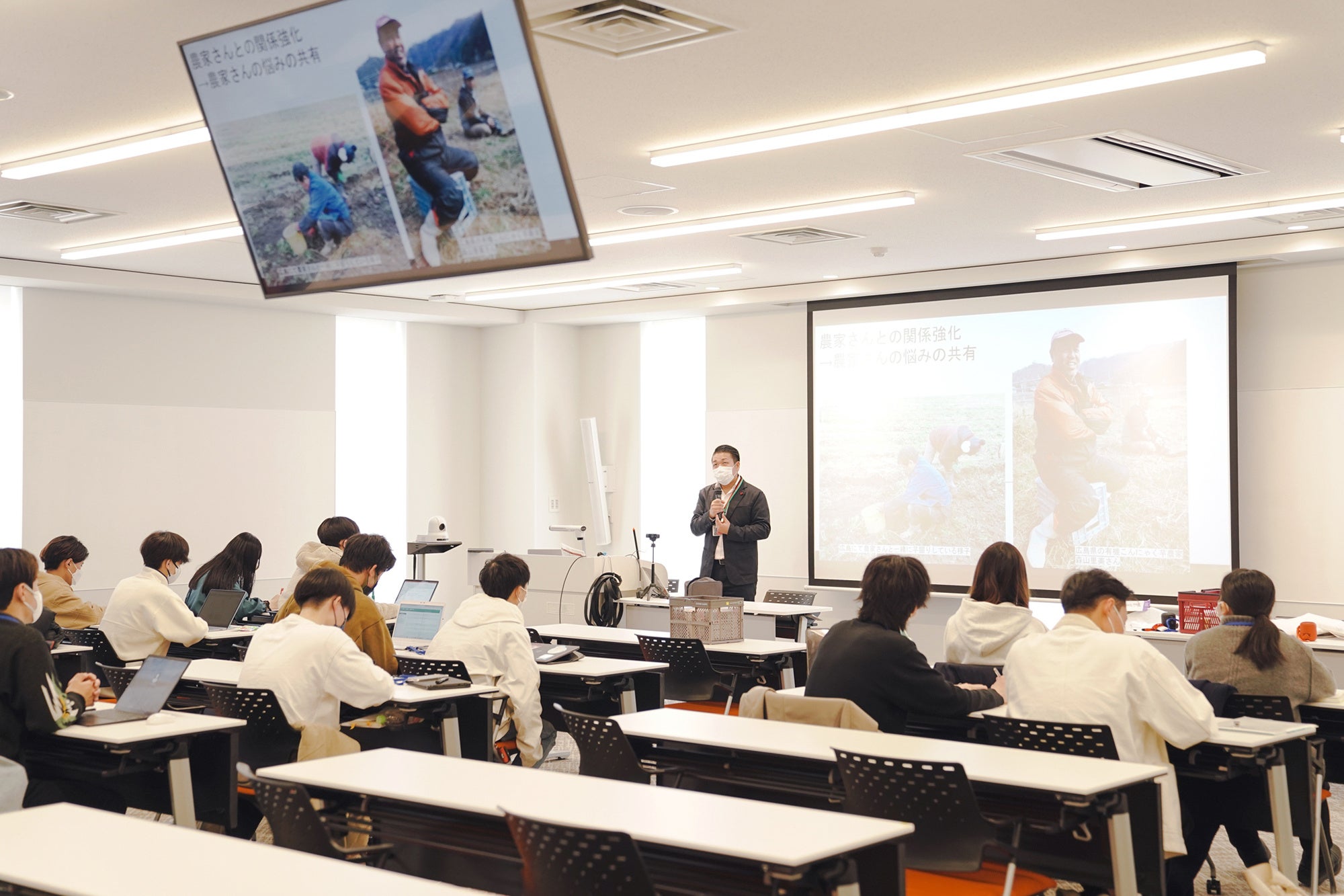 3月13日のキックオフでは、中尾食品工業株式会社の4代目代表となる中尾友彦さんから、自社の紹介からこれまでの取り組み、今後の展望、こんにゃくの特性やこんにゃく業界の現状、課題について学生の皆さまに講義が行われました。その後各チームに分かれ、ビジネスモデルの構造化を行う、一回目のグループワークを実施しました。