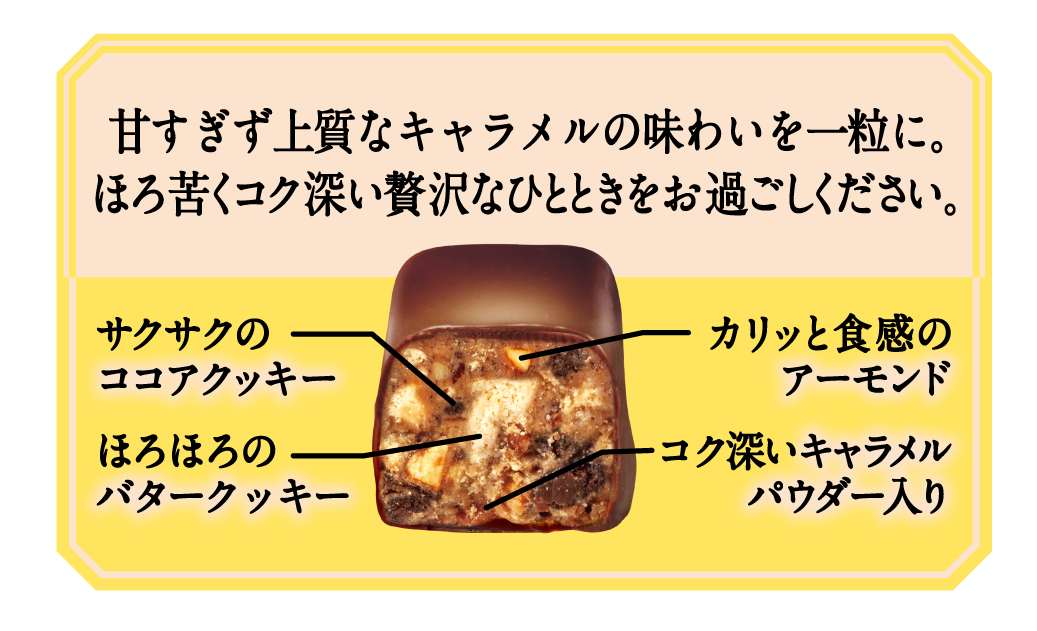 - ココアクッキー、バタークッキー、アーモンドを組み合わせることにより、さらにキャラメルの味わいにコクを出し、食感も心地よく仕上げています。