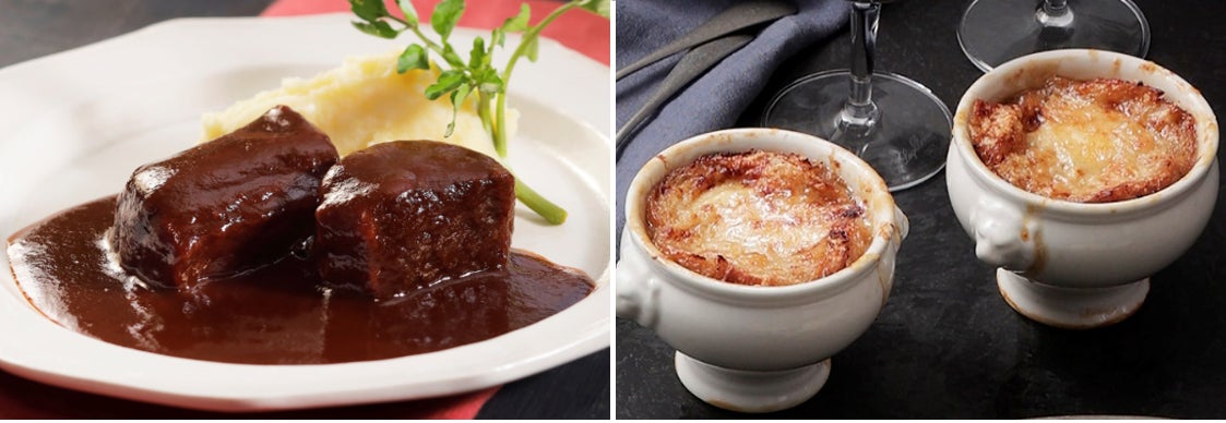 温かいほっとする優しい味わいのオニオングラタンスープに、柔らかく煮込んだ黒毛和牛のビーフシチューとマッシュポテトを詰め合わせたディナーセットです。お好みで前菜やサラダを添えるだけで、お家でコース仕立てのディナーが簡単にお楽しみいただけます。