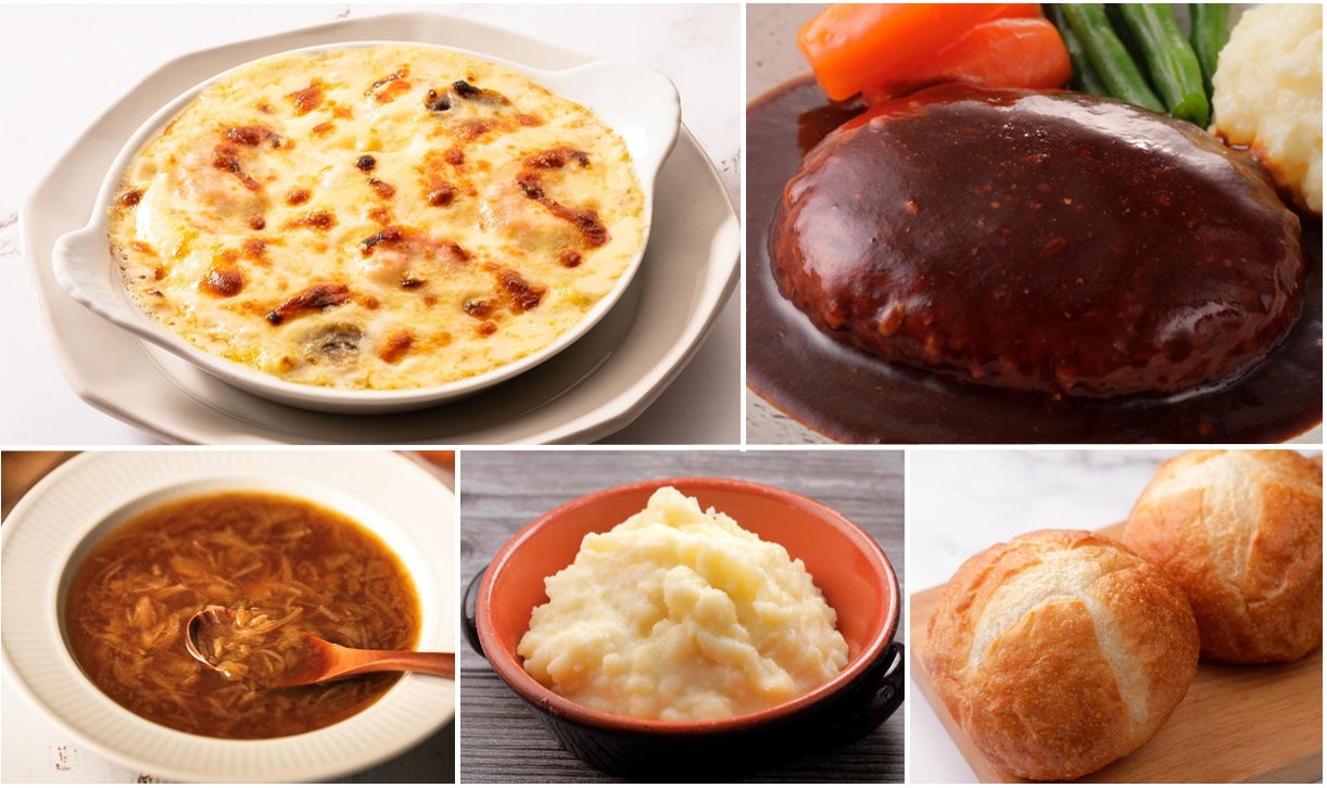 ・ごちそう海老グラタンx2 ・フレンチオニオンスープx2 ・ドミグラスハンバーグx2 ・キタアカリのマッシュポテトx1 ・ブール(2個入り)x1 (5種8品+ティラミス1品プレゼント)