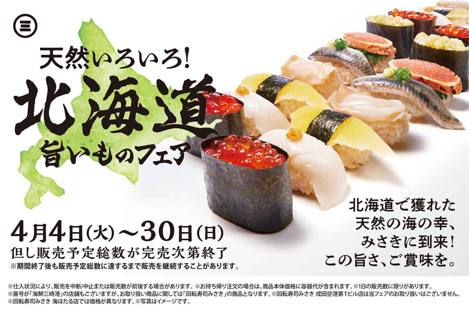 株式会社 京樽(本社:東京都中央区、代表取締役社長:堀江 陽)が展開する「回転寿司みさき(旧:海鮮三崎港)」では、4月4日(火)より『北海道旨いものフェア』を開催いたします。