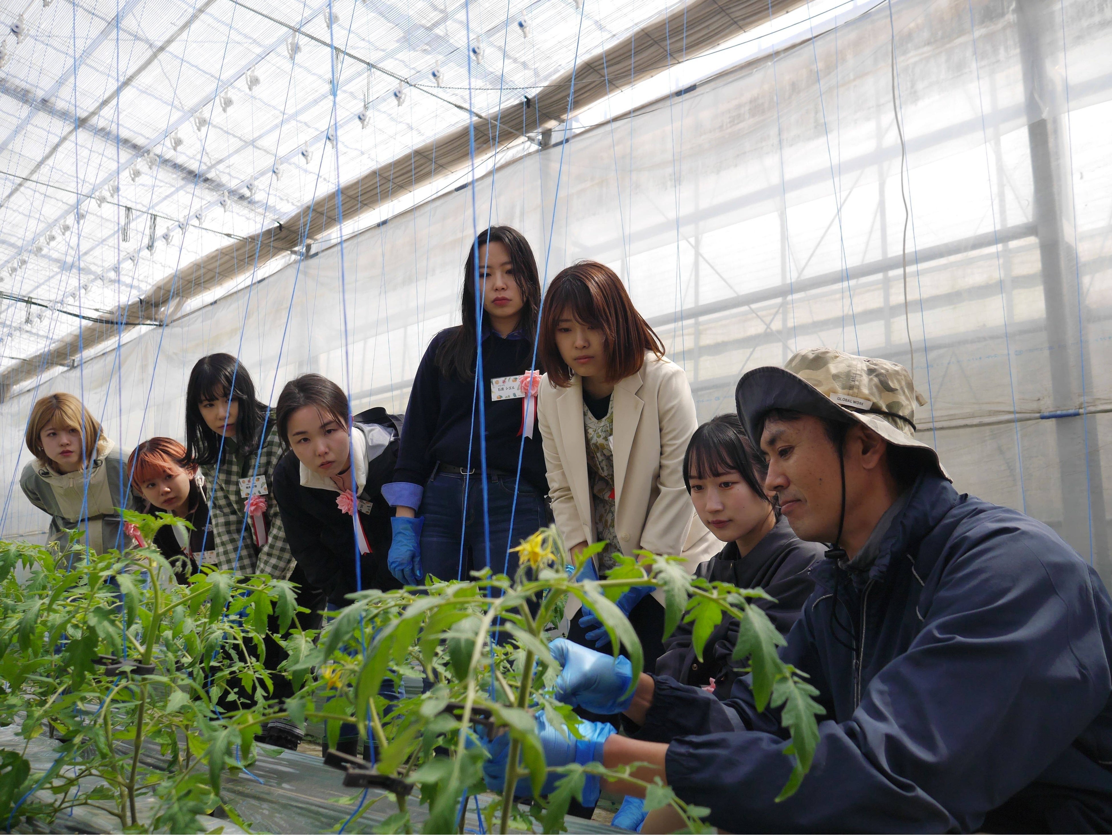プログラムは午前午後の2部構成。午前は当社取締役である小﨑からの挨拶、畑の中から自分の入社証書を収穫する“入社証書収穫”、入社への想いをトマトの苗に込め、成長を促す作業を行う“決意表明の苗”などが行われました。お昼は生産者との交流をしながら皆でランチを食べ、トマトのビニールハウスでの農作業を行いました。