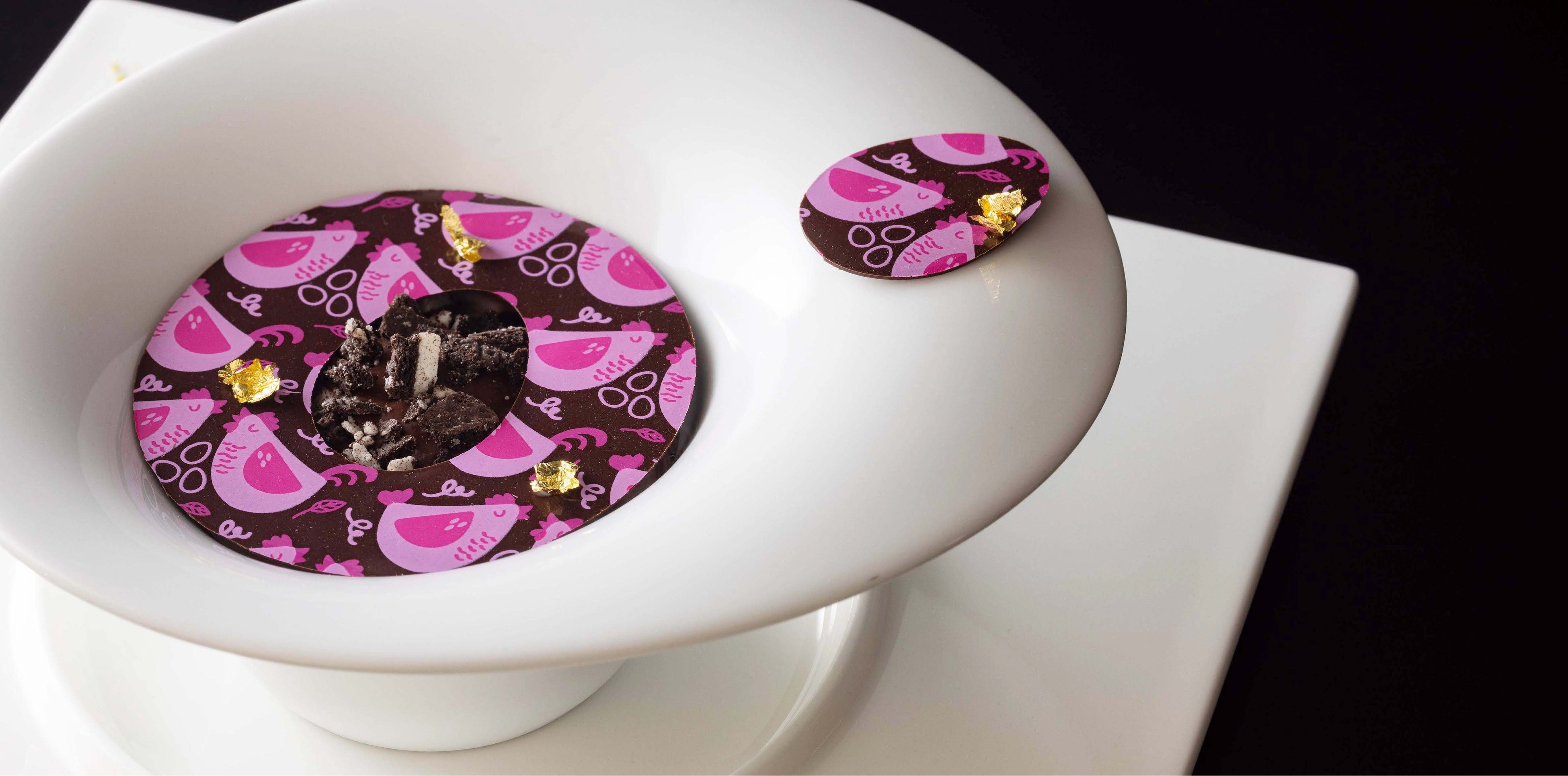 2023年の新作デザートは、ジョエル・ロブションのレストランで好評をいただいている「ショコラテンダンス」をイースターの象徴ニワトリをモチーフにしてご用意いたしました。春らしい鮮やかなピンク色のニワトリを描いたチョコレートに、なめらかなガナッシュと香り高いカカオのソルベ、さらにはサブレの食感も楽しめ、すべてのパーツにチョコレートを使用した贅沢なデザートです。