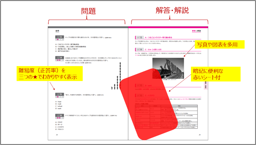 両問題集ともに、全問題解説付きで、学習しやすさを追求しました。レイアウトに工夫を凝らし、見開きで左ページが問題、右ページが解答・解説としました。また、今回は2色印刷で、解説内のキーワードは赤字にしています。暗記に便利な透明の赤いシートを付けていますので、効率的に学習をすすめることができます。