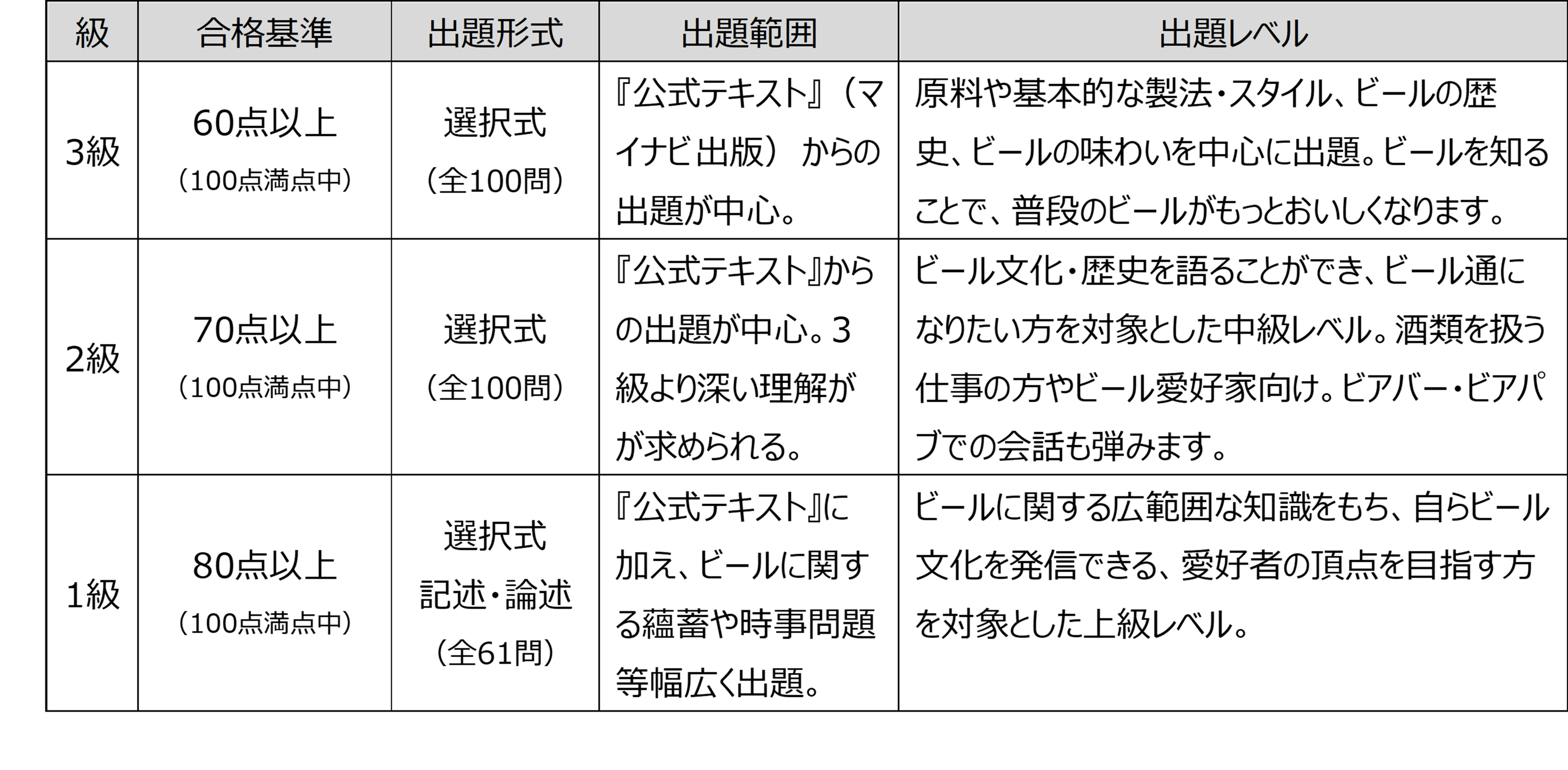・3級から1級を通して「100点満点」を達成した方に、日本ビール文化研究会が選定したビール1年分を進呈。対象者が複数の場合は、山分けとなります。