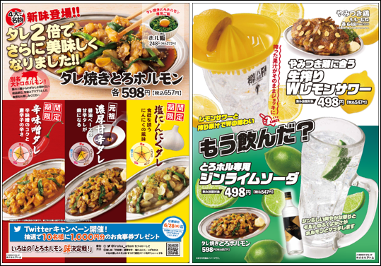 また、名物料理「やみつき鶏」と「とろホルモン」にピッタリな2種のドリンク「生搾りWレモンサワー」「ジンライムソーダ」が登場!是非ご賞味ください。