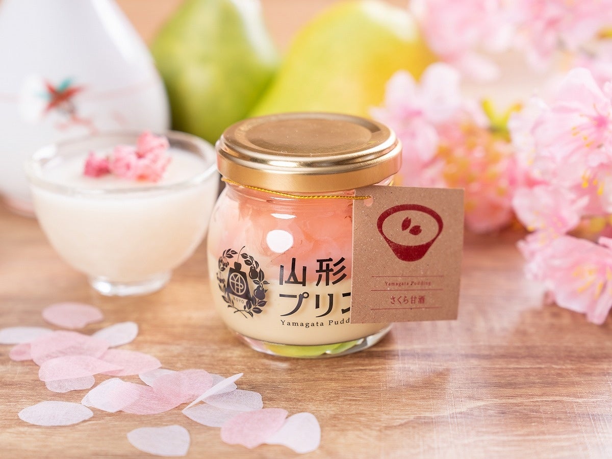 『もちもち食感の白玉と桜餡、桜の花が入った桜ゼリーで閉じ込めた和風のプリンが楽しめる春を感じられる一品となっております。 1番下のプリンには内藤醸造さんの『ラ・フランス甘酒』を使用して山形らしい味に仕上げました。 山形を代表する果物のラフランスと、国産の米にこだわった甘酒は口当たりがよく、滑らか食感のプリンと相性抜群です、』