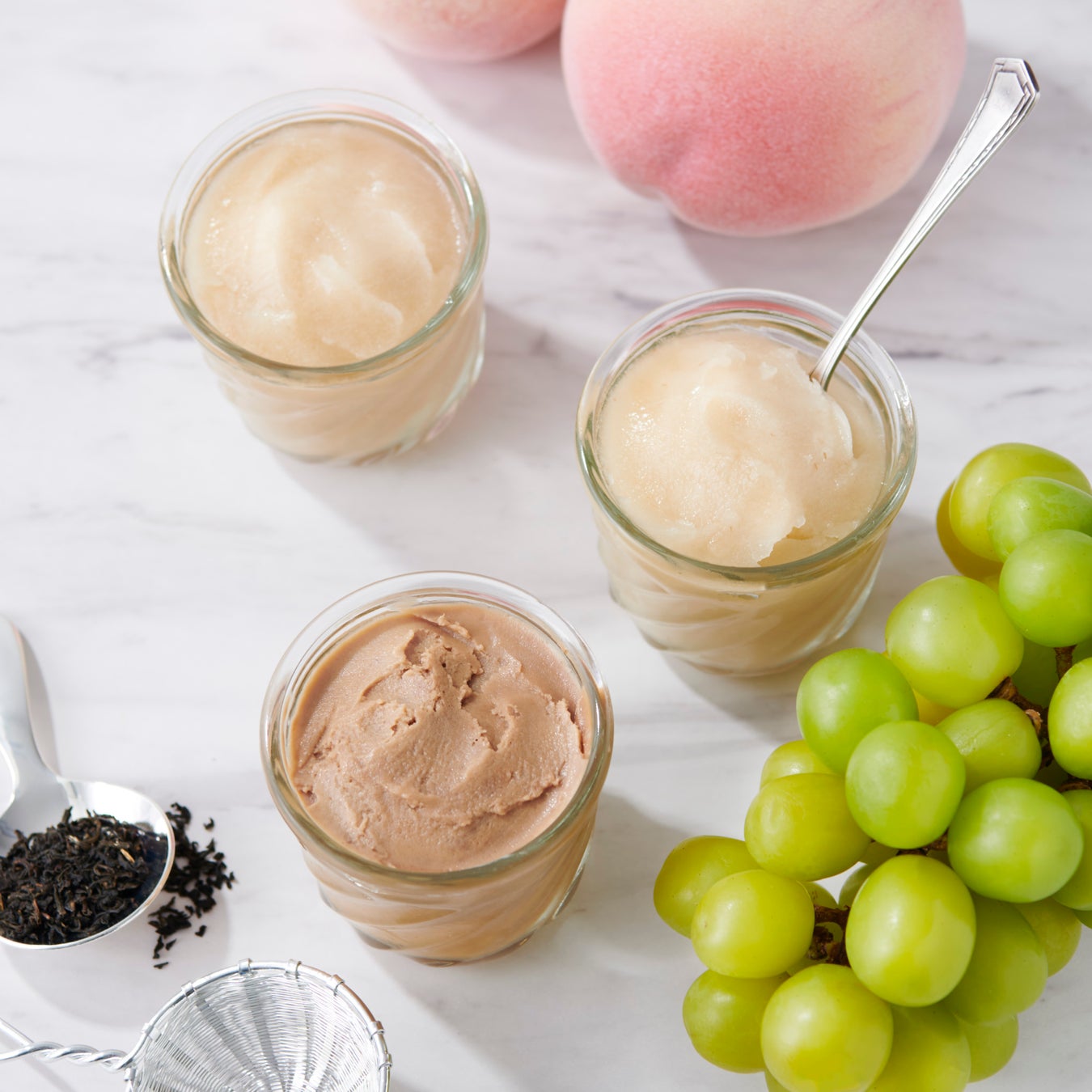 シャルドネダージリン、チャイ、ピーチアールグレイ、それぞれ香り豊かな紅茶の味わいが楽しめる「ティーシャーベット3個セット」は、Afternoon Teaで人気の味をグラスデザートに仕立てたものです。