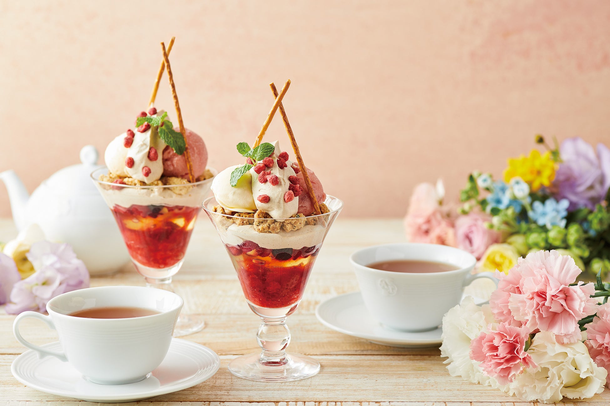 焼き菓子5種を詰めて小さなお花のブーケに見立てた華やかなピンクカラーのお菓子缶“フラワーアンサンブル”と、フルーティーな香りの夏のアイスティーをセットにした「フラワーティータイムボックス」のほか、ティールームで楽しめる「苺とアールグレイのパフェ」も発売します。