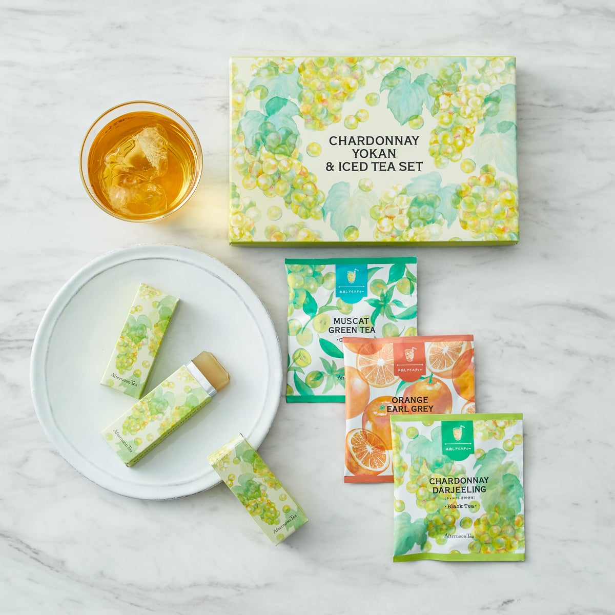白あんにシャルドネ果汁を合わせたフルーツ羊羹「シャルドネ白あん羊羹」と、相性のよい3種類の水出しアイスティーの詰め合わせ。芳醇で瑞々しいシャルドネと上品な白あんの味わいの羊羹はぜひ冷やしてお楽しみください。